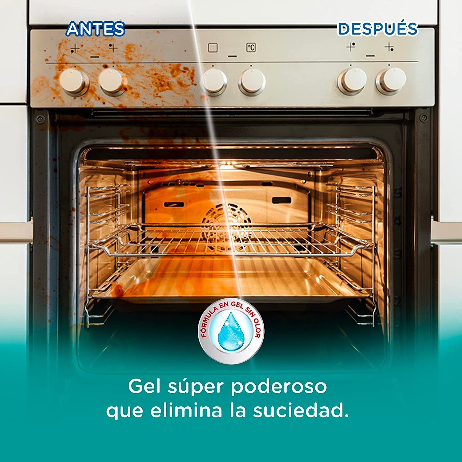 El gel super poderoso de Limpia Hornos se adhiere a superficies verticales y elimina rápidamente restos de comida quemada y pegada, suciedad y grasa del horno.