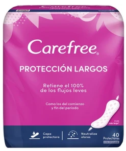 CAREFREE® Protección Largo Con Perfume Los protectores diarios CAREFREE® Protección Largo son ideales para los días previos y posteriores a tu periodo menstrual ya que tiene una película protectora en la parte de atrás que sirve para retener flujos menores y mantener tu ropa interior siempre limpia. CAREFREE® Protección Largo es 3 cm más largo* que los protectores convencionales para brindarte más seguridad y frescura a lo largo del día. Además tiene una superficie delicadamente suave porque está hecho con lo mejor del algodón. Logra neutralizar la humedad del área intima en 3 segundos y posee neutralizador de olores para que te sientas más segura todo el día, todos los días. Beneficios- Retiene flujos menores como los del comienzo y fin del periodo menstrual